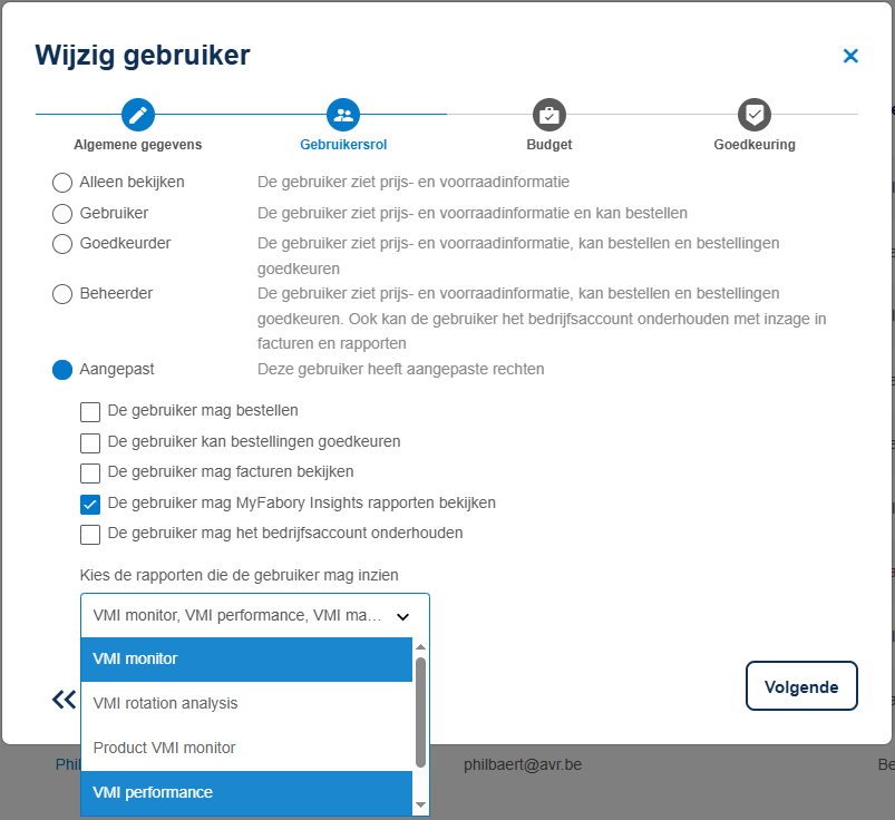 U kunt eenvoudiger bepalen welke dashboards van MyFabory Insights een collega mag zien. De beheerder gaat naar ‘Gebruikersbeheer’ onder ‘Bedrijfsgegevens’. Diegene beheert hier eenvoudig de verschillende toegangen van de collega’s tot de dashboards van MyFabory Insights.