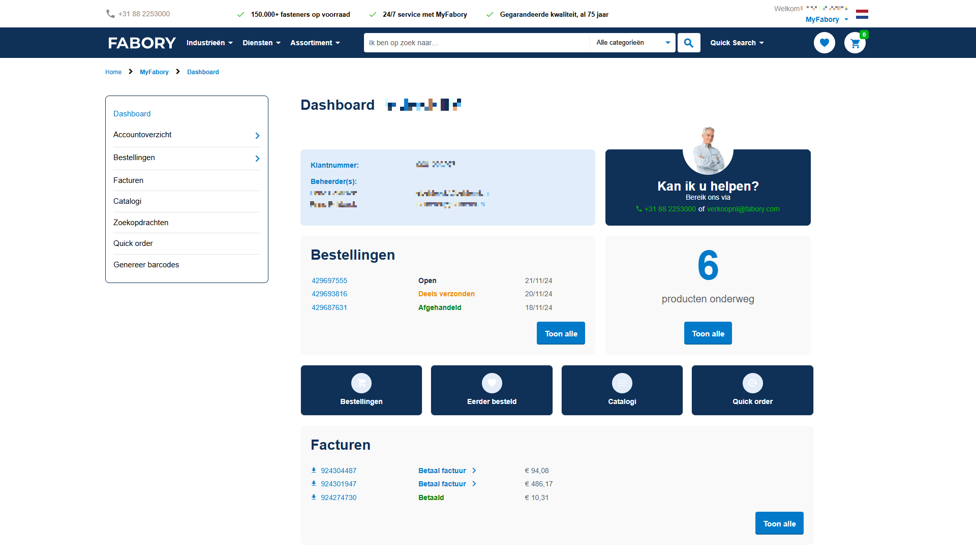 - Het MyFabory-dashboard biedt u in één oogopslag een overzicht van openstaande bestellingen, facturen en producten die nog onderweg zijn. Daarnaast vindt u er informatie over uw account, zoals uw klantnummer en de beheerder van het MyFabory-account. Heeft u een openstaande factuur? Via het dashboard vindt u een handige betaallink. Kortom, alles op één plek! Bekijk hieronder een voorbeeld van het MyFabory-dashboard.