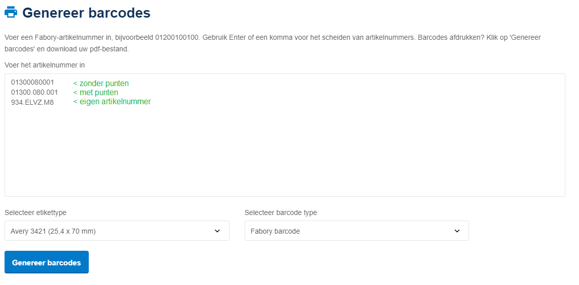 - Bij het genereren van barcodes voor uw magazijn kunt u nu ook uw eigen artikelnummers gebruiken! Daarnaast hoeft u hoeft niet langer de punten uit het Fabory artikelnummer te verwijderen, voordat u de barcode genereert.