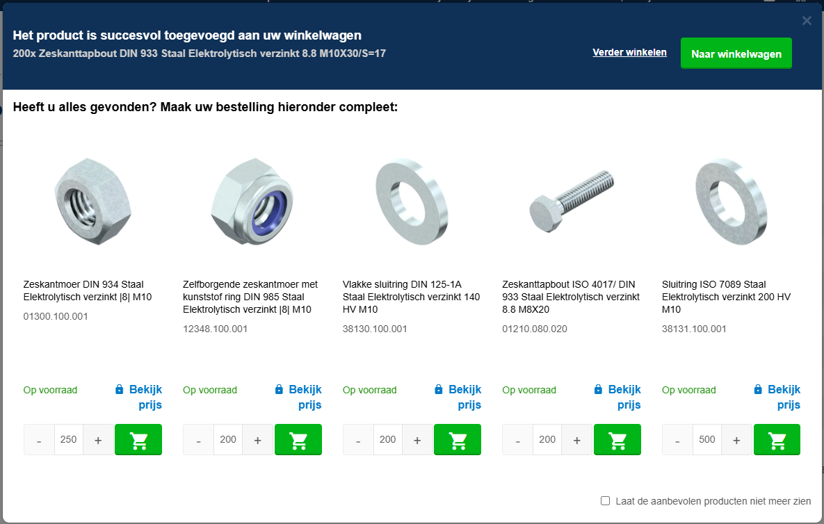 - Wanneer u een product aan uw winkelwagen toevoegt, krijgt u voortaan suggesties voor aanvullende producten. Dit zijn artikelen die handig kunnen zijn in uw dagelijkse productieprocessen, zoals handschoenen, remmenreiniger of schroefdraadborging.